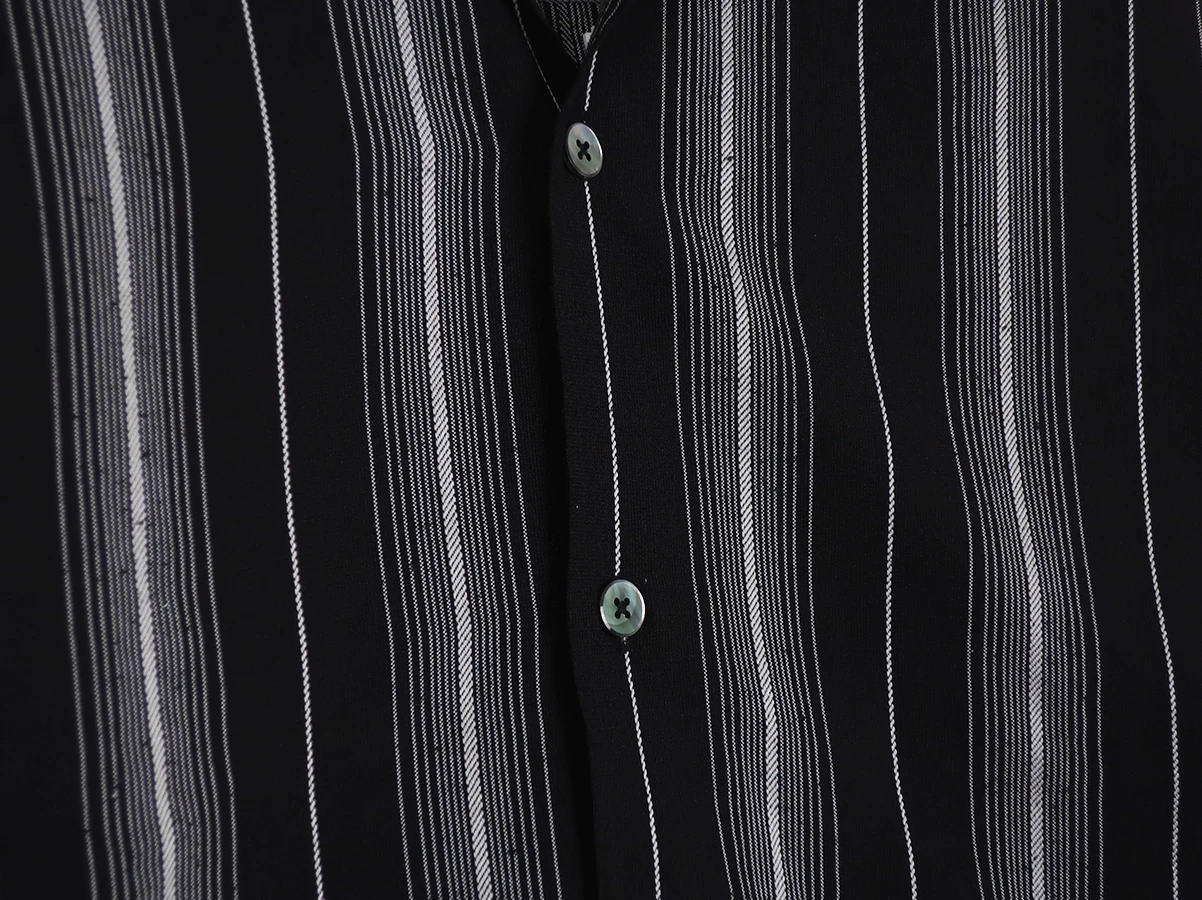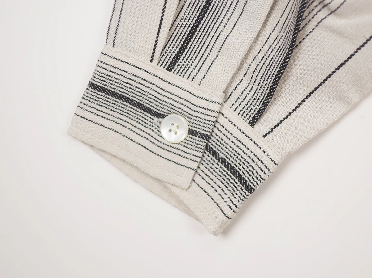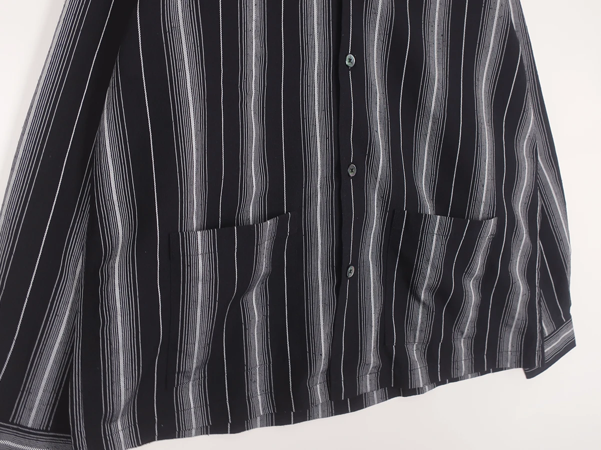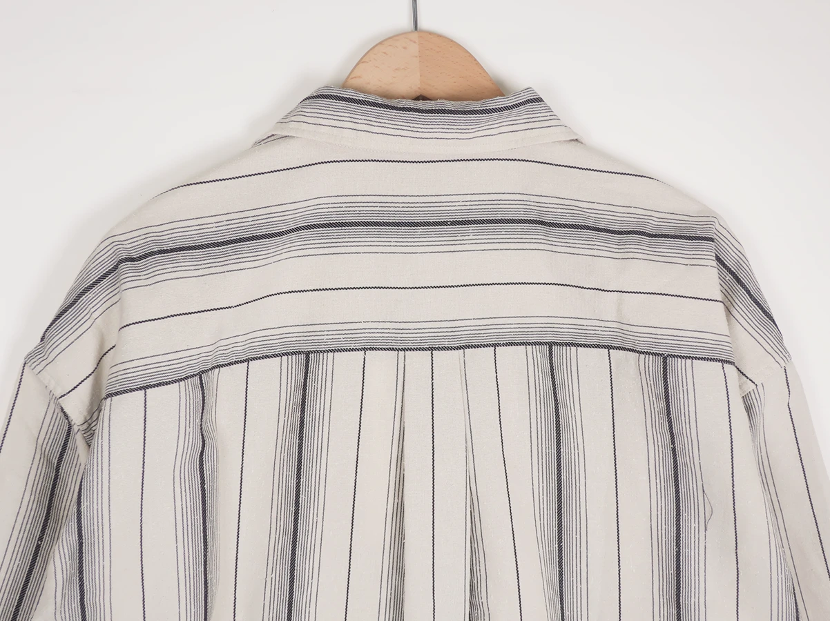 レーヨン、シルクネップ、ポリエステルの三者混ストライブ生地を使用。