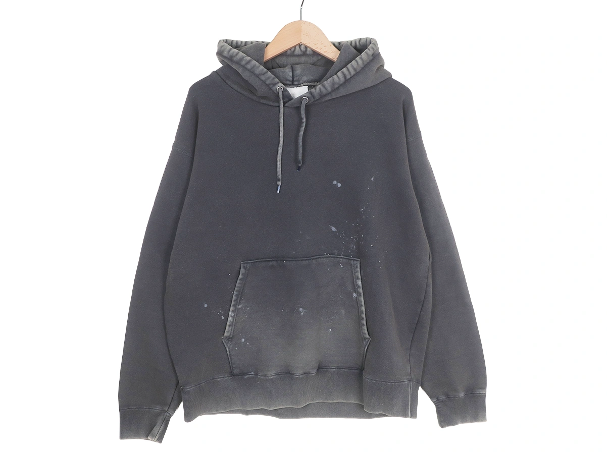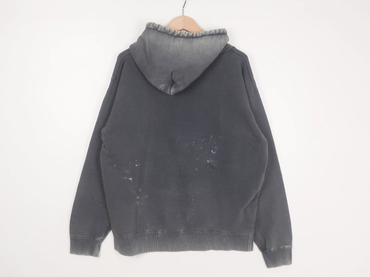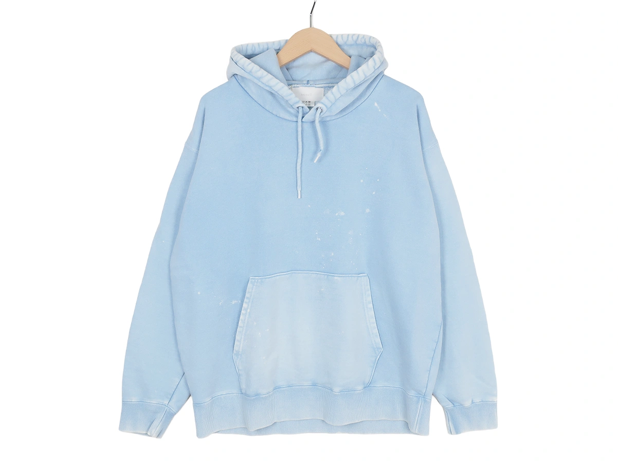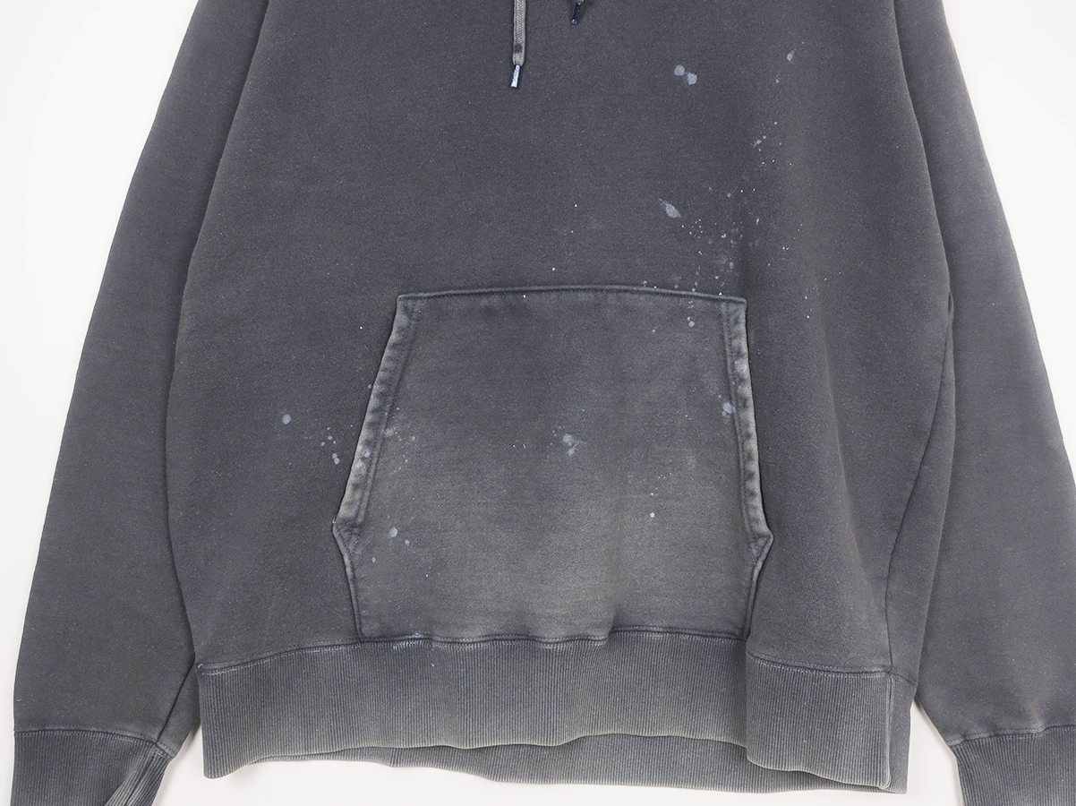加工を施したフーディです。洗い加工は水や薬品の使用量を軽減させながら生地の凹凸部分のアタリを強調させ、同時に脱色させる新しい加工技術。日焼けして着古したような激しい加工ながらも垢抜けた印象。