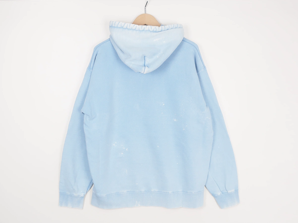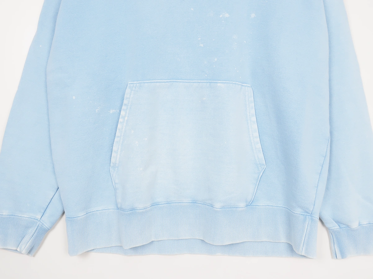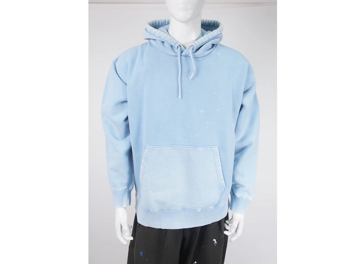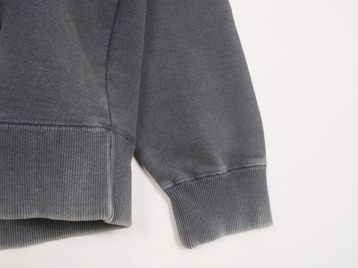 加工を施したフーディです。洗い加工は水や薬品の使用量を軽減させながら生地の凹凸部分のアタリを強調させ、同時に脱色させる新しい加工技術。日焼けして着古したような激しい加工ながらも垢抜けた印象。