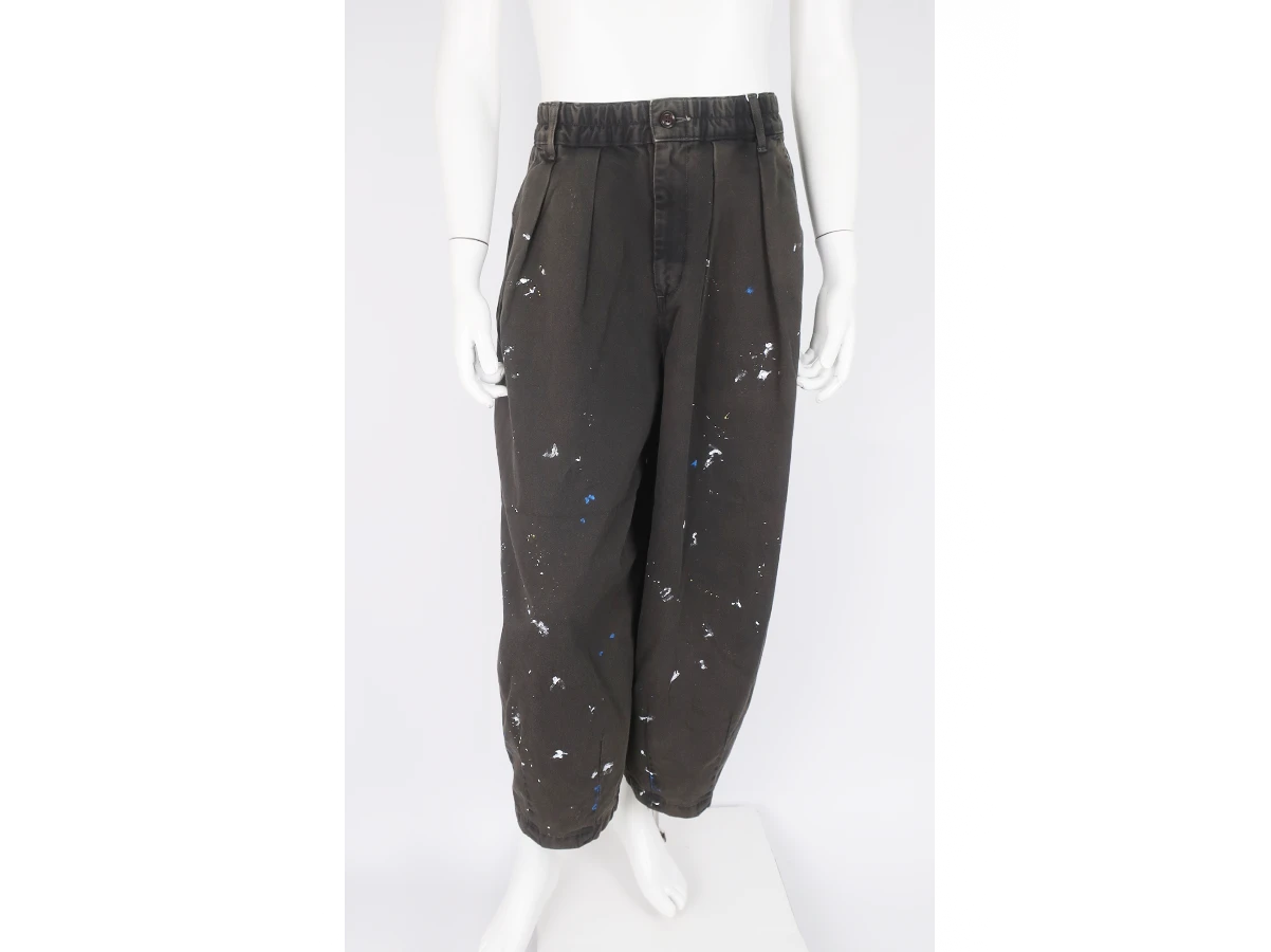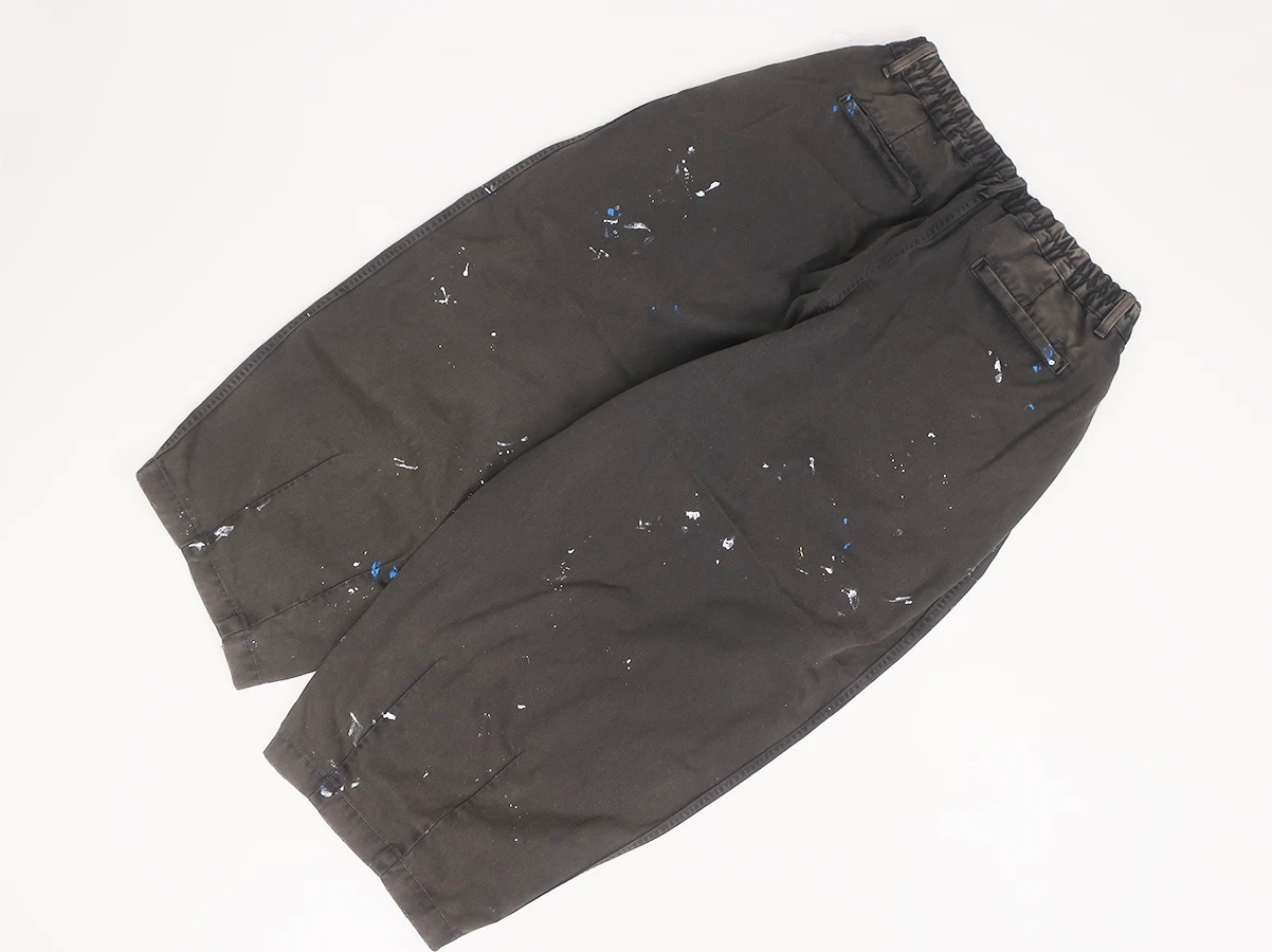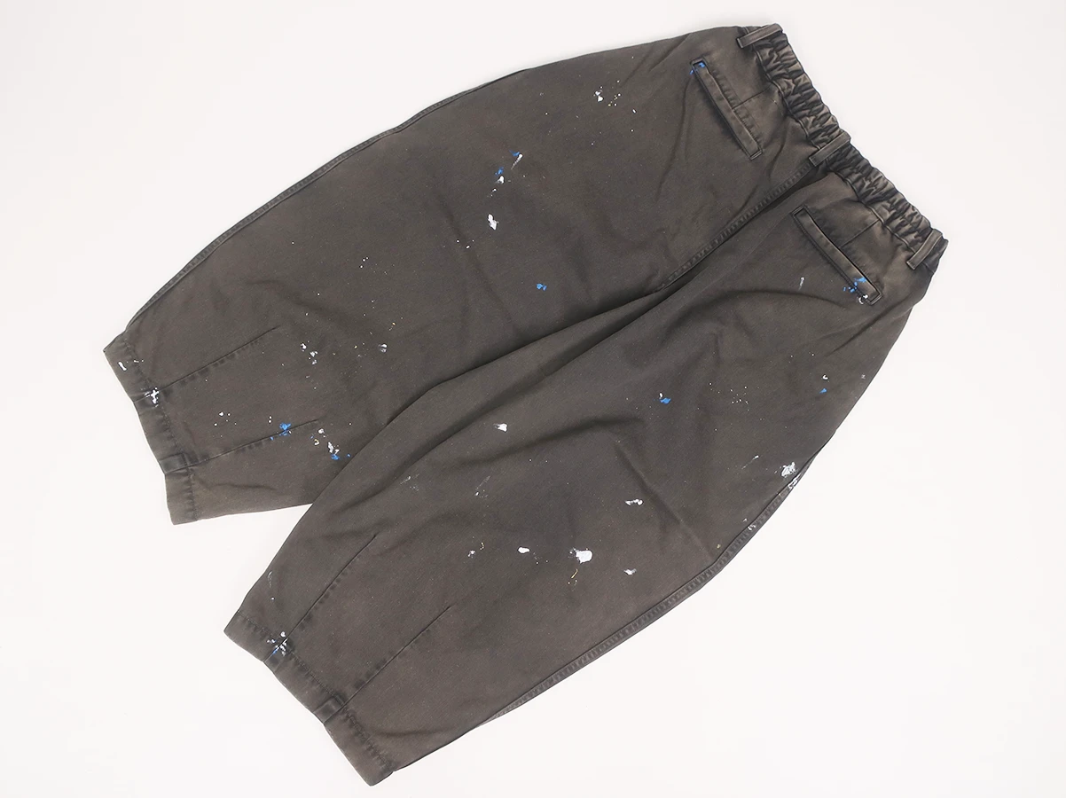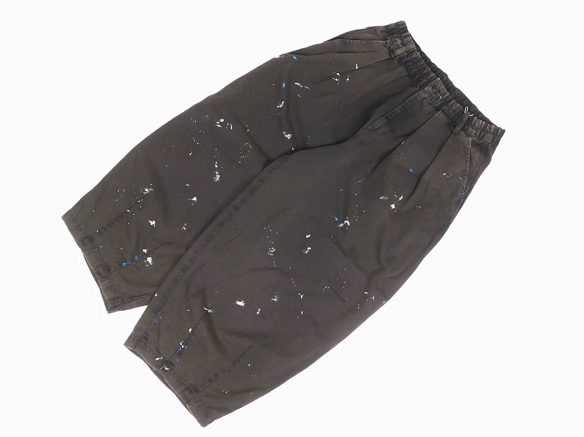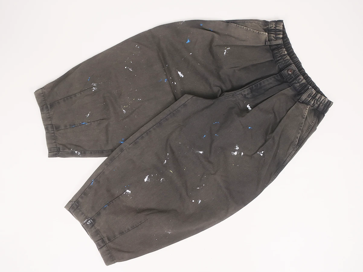 HARVESTYのサーカスパンツのハードリメイク。フロントにタックを、スソにダーツを施し、大胆なボリュームシルエットに仕上げた ”サーカスパンツ”。