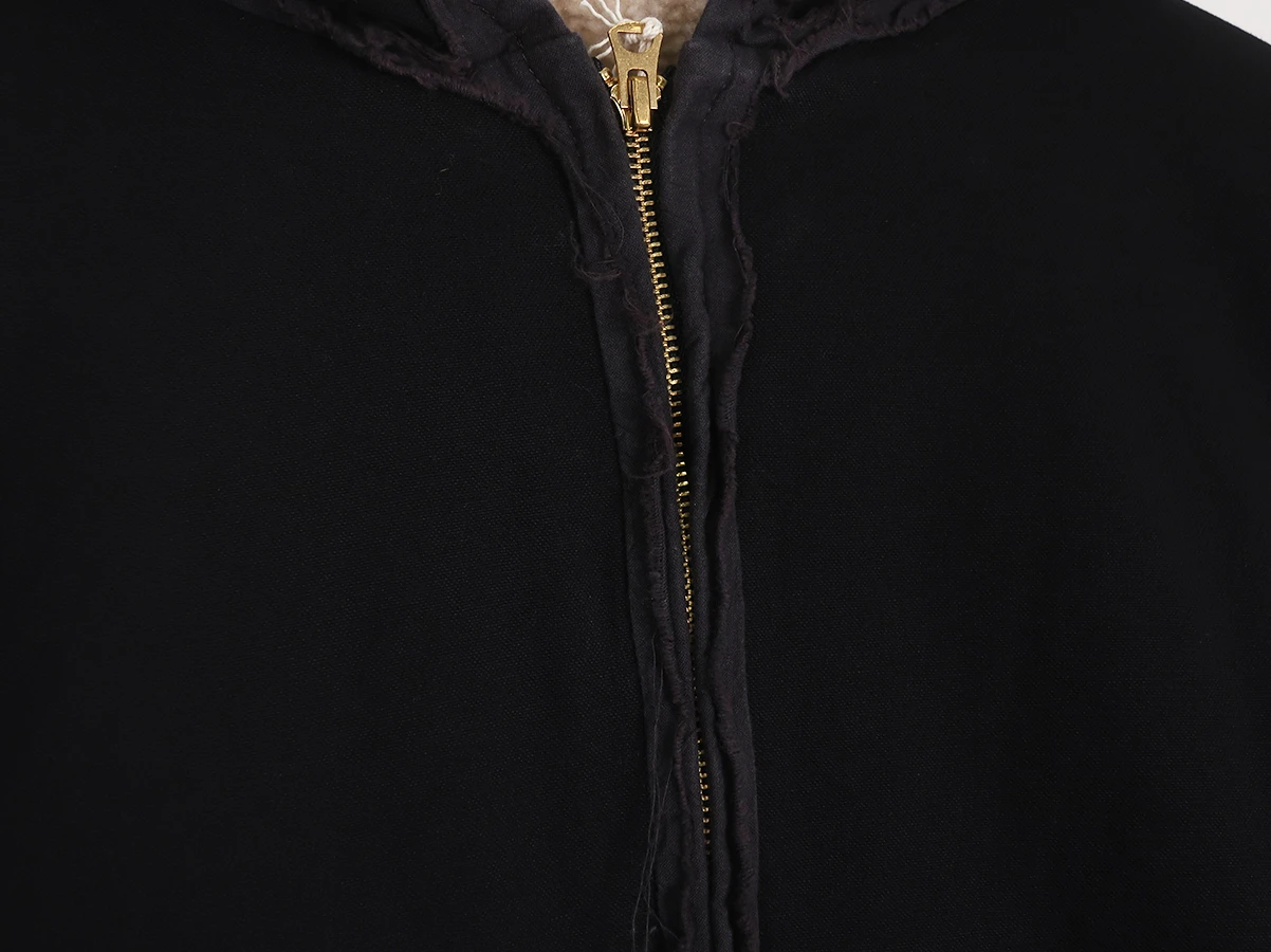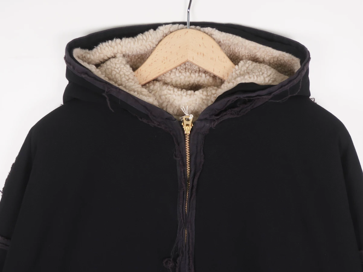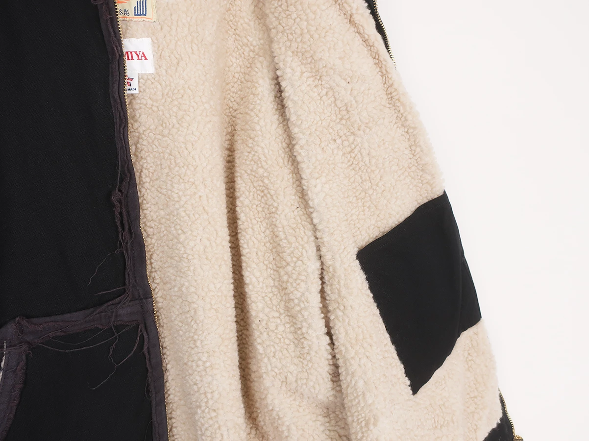 キャンバス生地とライトウェイトのコットン生地を2重にして縫製した後に職人の手仕事でカットオフを施しました。オーバーサイジングで保温性に優れたボアライニング仕様。