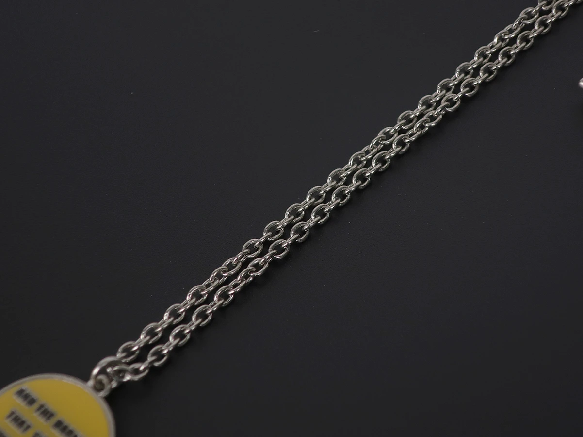 丸型チャームに配されたグラフィックロゴが、シンプルながらもしっかりと主張するチャームネックレスです。