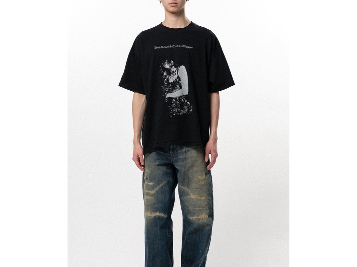 TC天竺生地を使用したグラフィック半袖Tシャツです。裾にピスネーム。サンドウォッシュ加工。オーバーシルエット。
