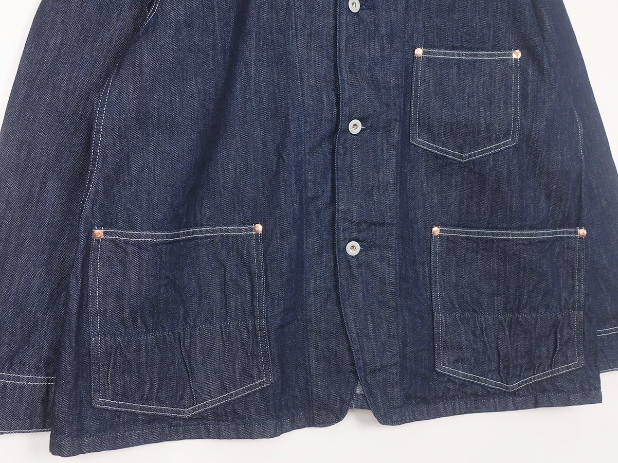 9ozのソフトデニムを使用したカバーオール。程よく軽さのある生地感でデニム特有の硬さを抑えつつ、着用と洗いを重ねるごとに自然な風合いが増していきます。