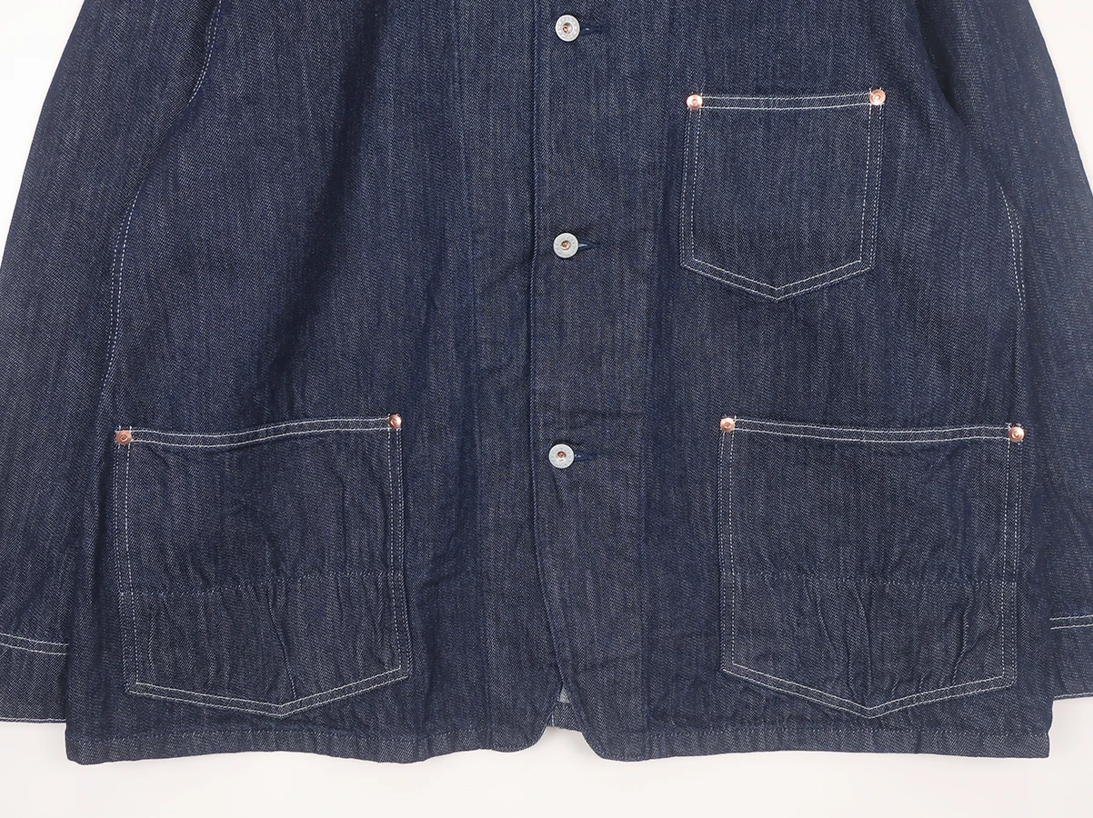 クラシックなカバーオールをベースにしながら身幅にゆとりを持たせた現代的なバランス。フロントの大きめポケットや配色ステッチなど、ワーク由来のディテールもさりげなく効いています。