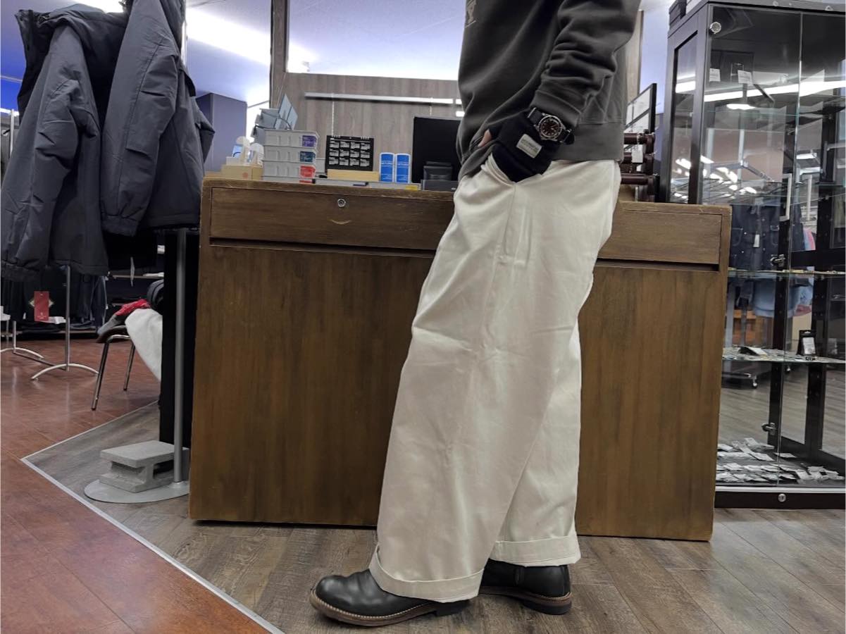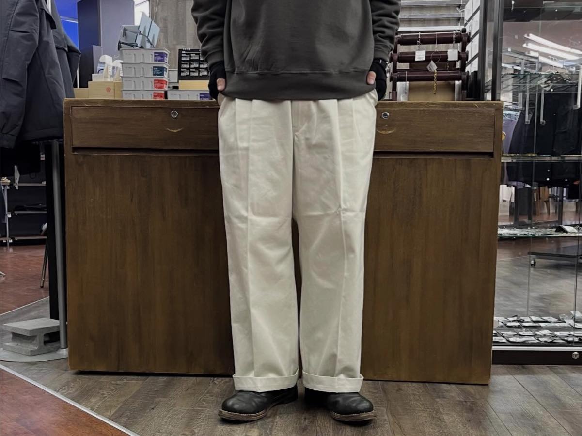 IVORYカラーは上品さがあり、シャツやカバーオール、カットソーまで幅広く対応。ワーク由来の素材感とトラウザーらしい品の良さがバランスよくまとまった一本です。