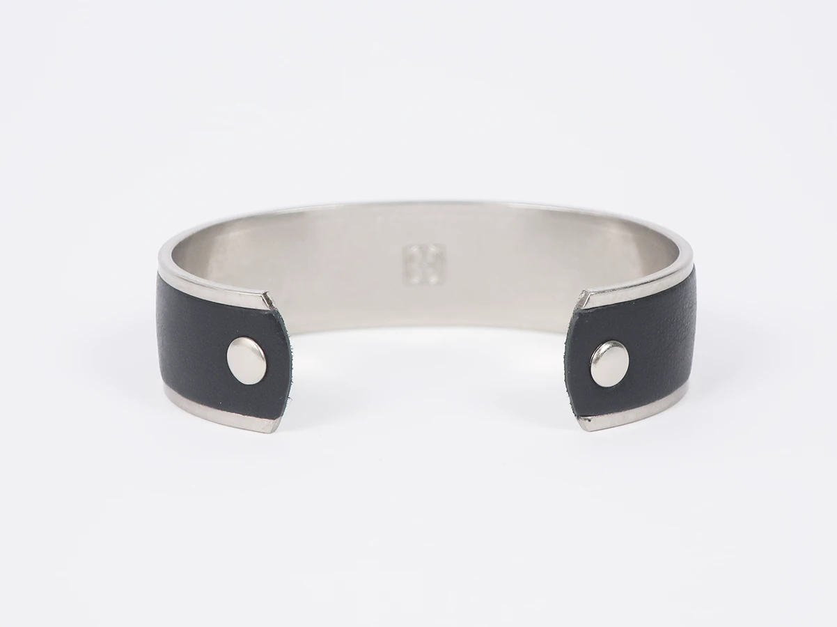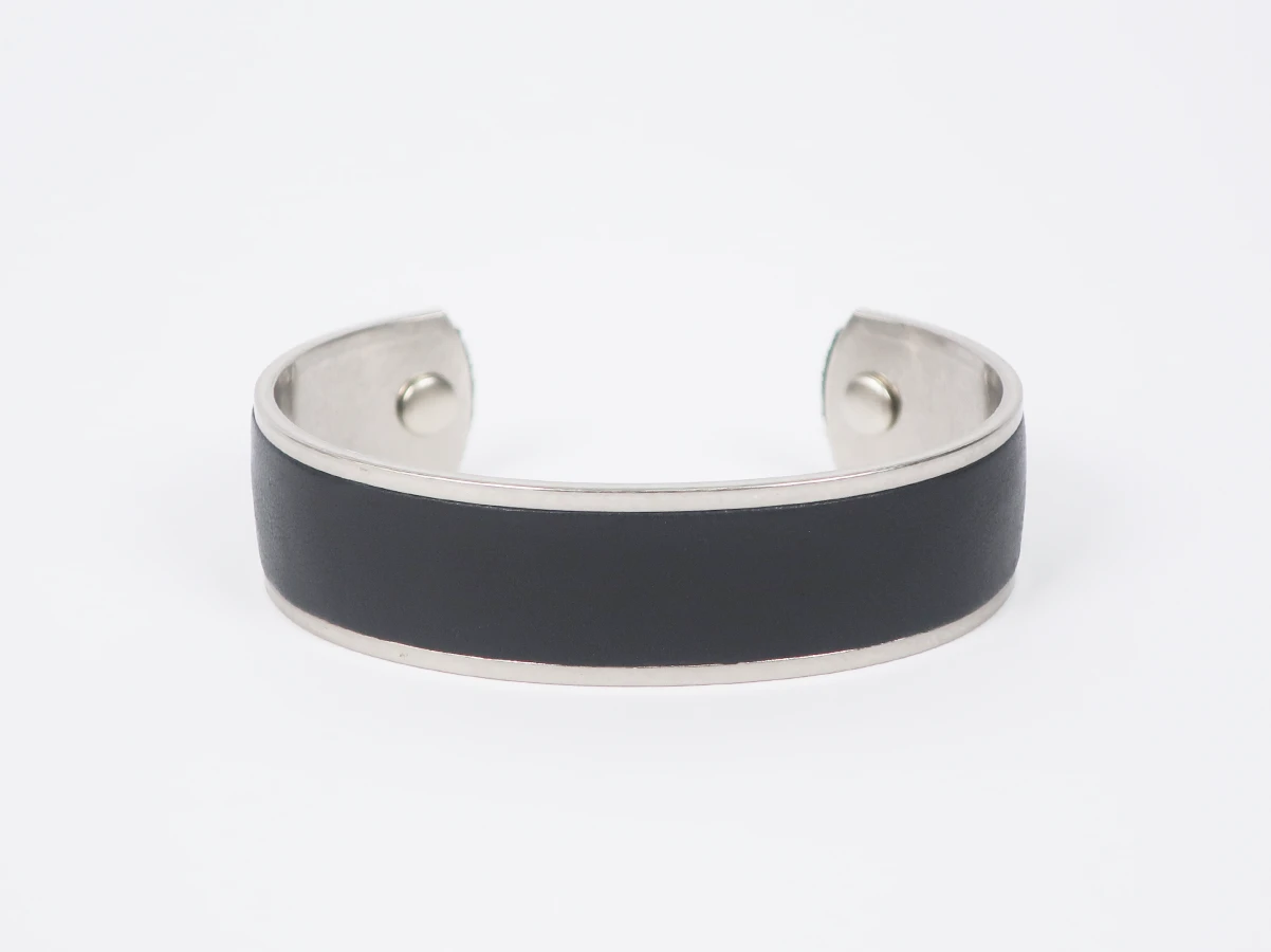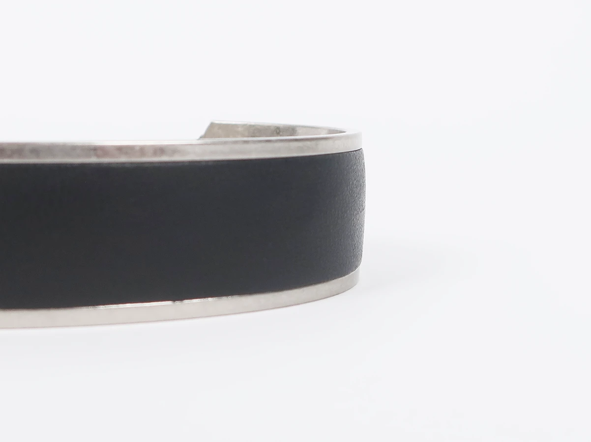 凹字型のブラス製プレートの溝を埋める形でシュリンク加工を施したカウレザーをあしらった、コンビ素材のブレスレットです。
