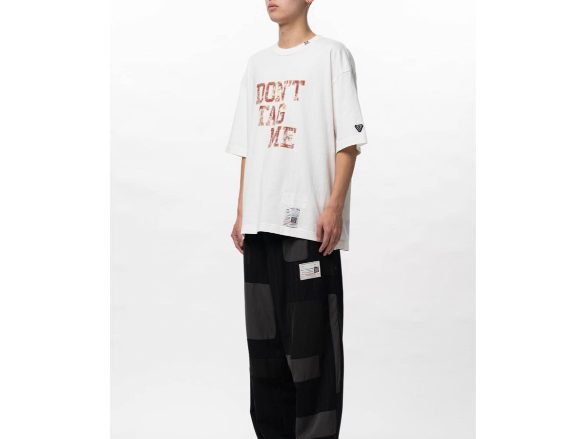 フロントに大胆に配された「DON’T TAG ME」のメッセージが印象的な、Maison MIHARA YASUHIROのプリントTシャツ。グラフィックは単なるロゴ表現に留まらず、反骨的かつユーモラスな世界観を感じさせる仕上がりとなっています。