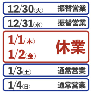 ※ 12/30(火)、12/31(水)は振替営業となります。年末年始の期間の交通集中による渋滞の発生や運送会社の窓口営業時間短縮・臨時休業により当日発送やお荷物の配送日時指定をお受け出来ない場合がございます。