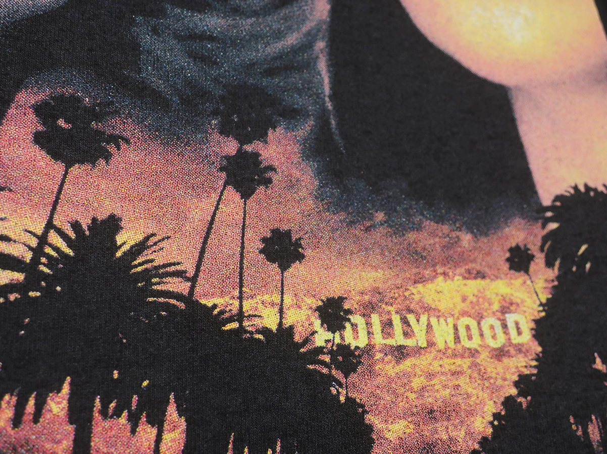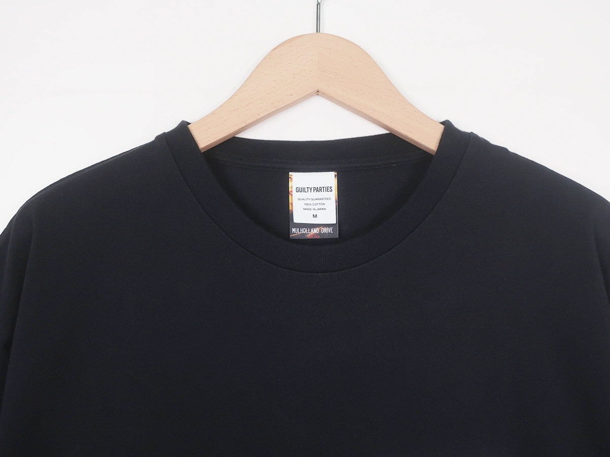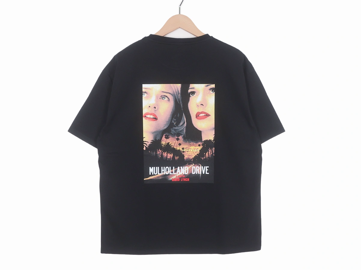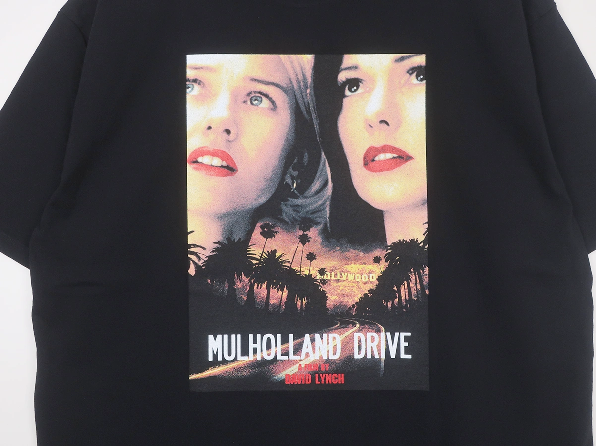 映画 MULHOLLAND DRIVE とのコラボレーションモデル。フロントは左胸にロゴを配置。背面には作品のビジュアルを大胆にプリントした存在感のあるデザインです。