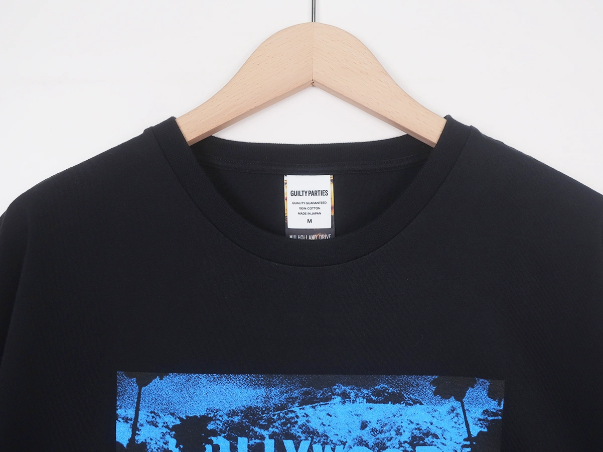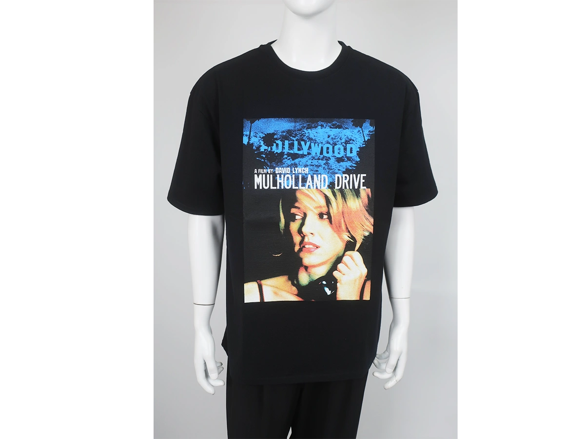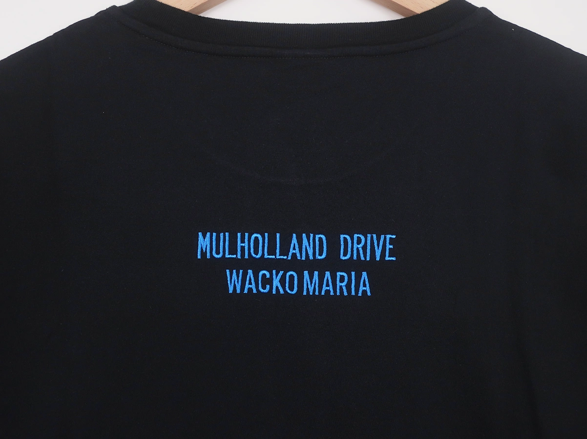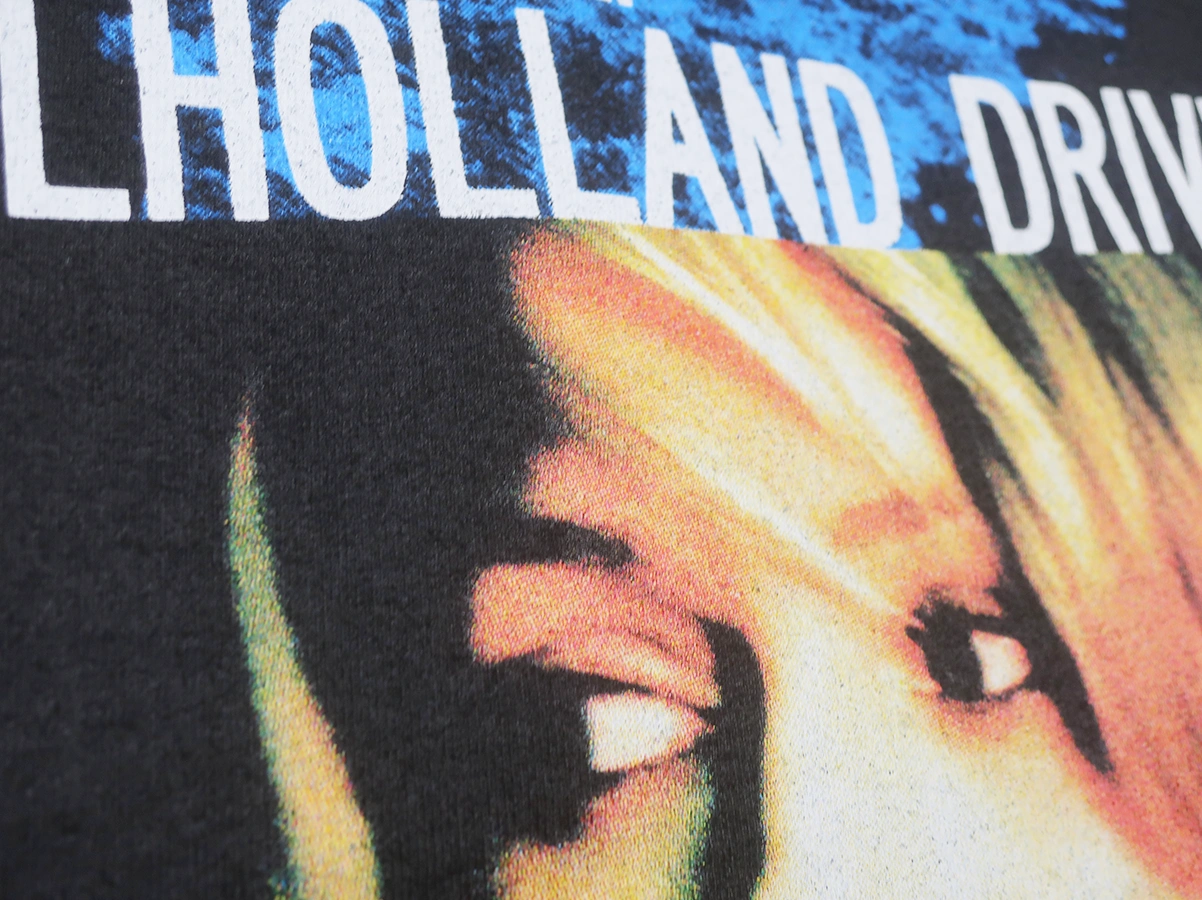 映画 MULHOLLAND DRIVE とのコラボレーションによるクルーネックTシャツ。フロントに作中のビジュアルとタイトルロゴを大判でプリントしています。