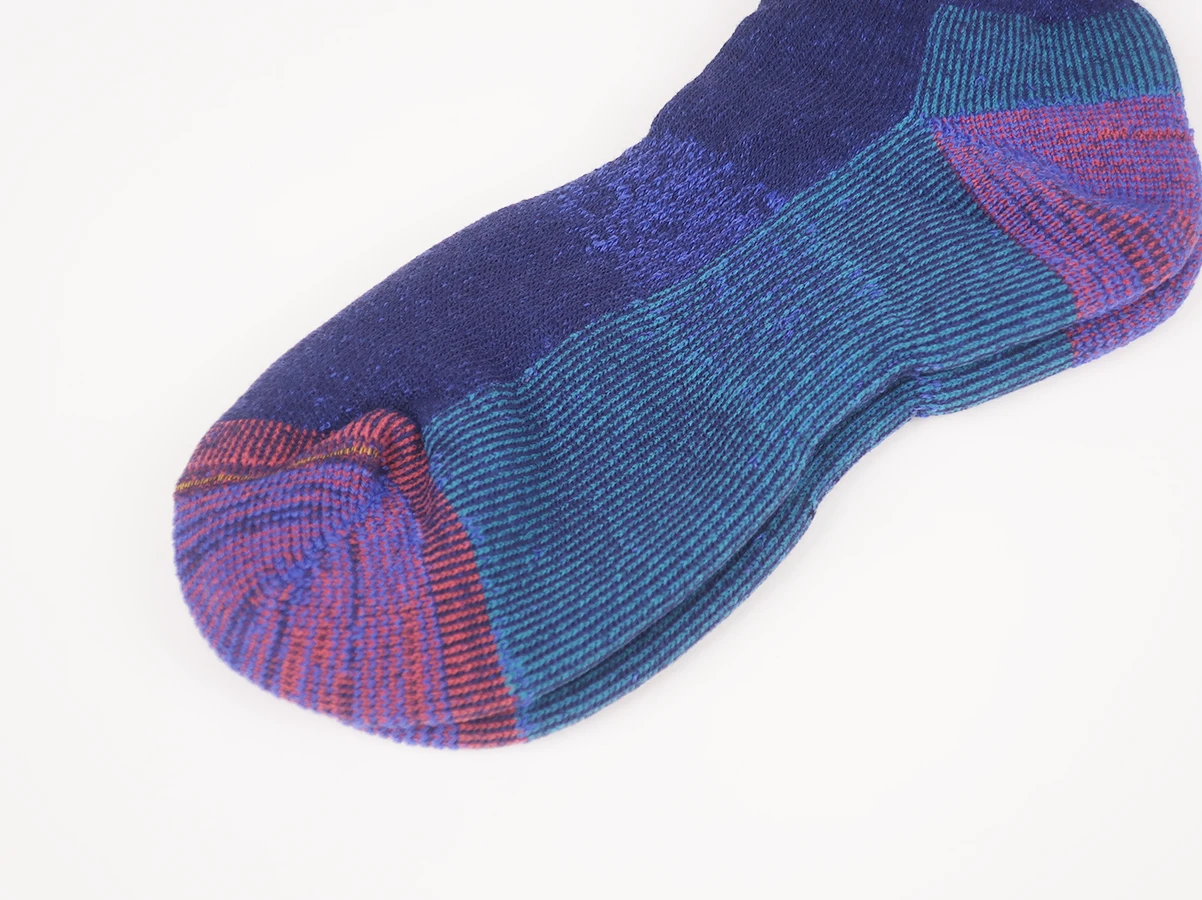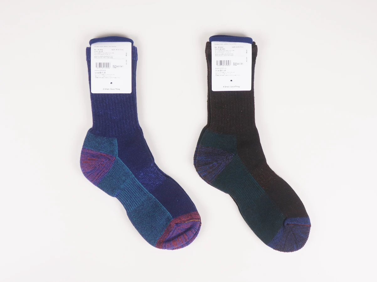 アウトドアやトレッキング用ソックスをデザインソースに、日常使いに適したフィット感へと落とし込んだ、メリノウールのパイルソックス。ウールが持つ“摩擦に弱い”という弱点を補うため、特殊な技術により表面をコットンで覆うように編み立て、耐久性を高めています。また、つま先・かかと・足底の配色部分にはナイロン糸を使用し、さらに補強を加えています。