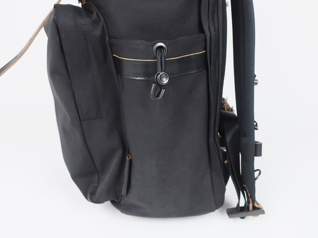 メインとなる収納に加え、天板被せにジッパーポケットが一つ。見頃に縦型のジッパーポケットが並んで二つ。両サイドにコードストッパー付きポケットが二つ。さらに内側の背面にはL字ポケットを配備。メイン収納へはサイドのジッパーから簡単にアクセス可能なので、気軽に物の出し入れができます。