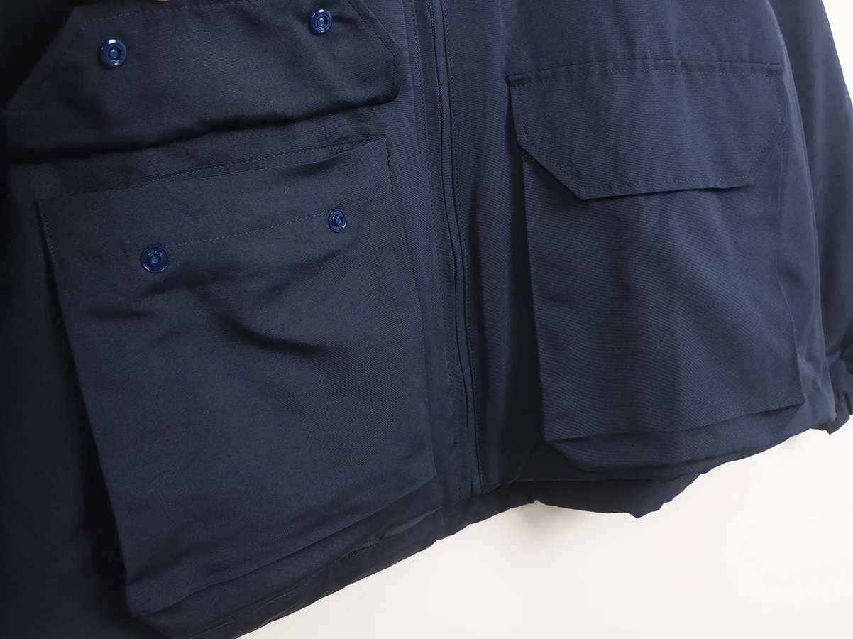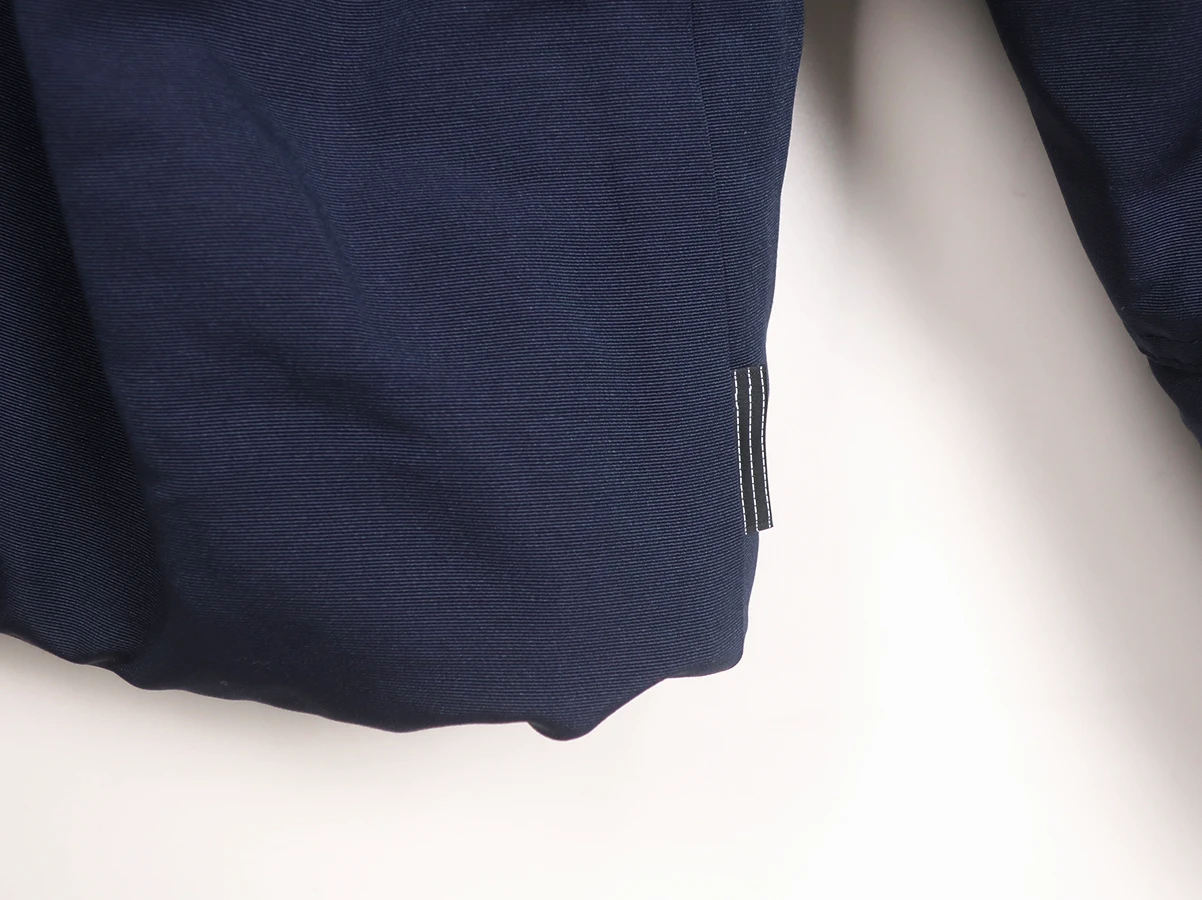 素材は適度なハリ感と表面の畝が上品に見えるグログランナイロンを使用。緯糸に綿を使用する事でナチュラルな風合いを持たせています。内側にはボリューム感のある中綿を入れ保温性を持たせています。