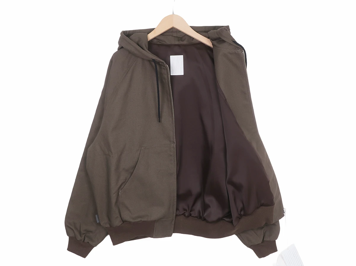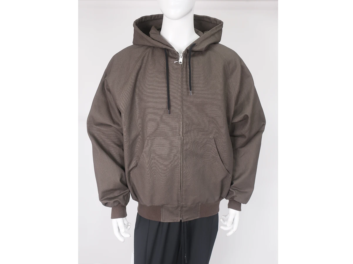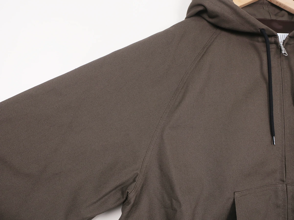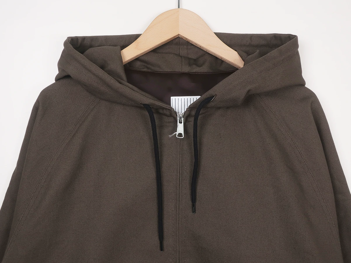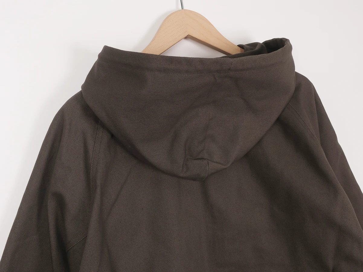 ワークジャケットでありながら、余計なディテールは取り除きクリーンなイメージに仕上げたオーバーサイズのダックフーディージャケット。