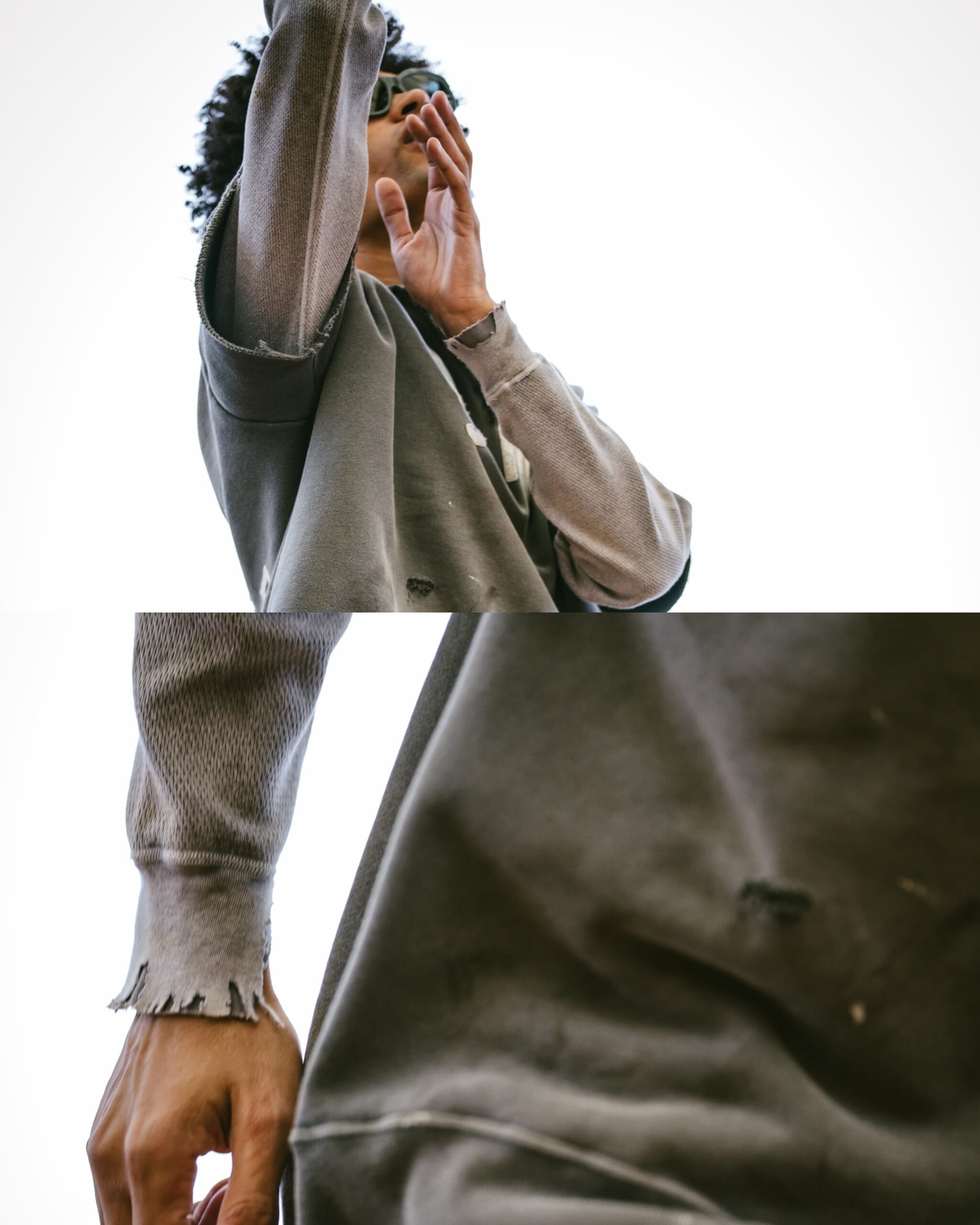 全体には汚しやフェード、ダメージ感を加え、ブランドらしい強い加工感を表現。着古したような空気感がありながら、ハーフジップのデザインによって一枚でもしっかり存在感の出る仕上がり。