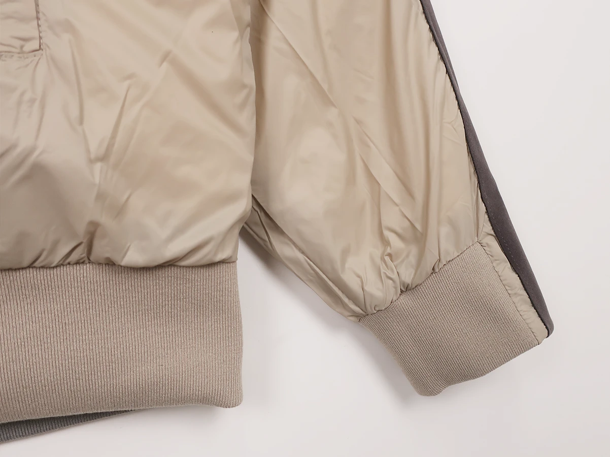 表側の袖には、渋い光沢感のあるベロア生地の配色ライン、裏側はヘチマキルトダウン、気分やコーデに合わせて楽しめるリバーシブル仕様に仕上げました。