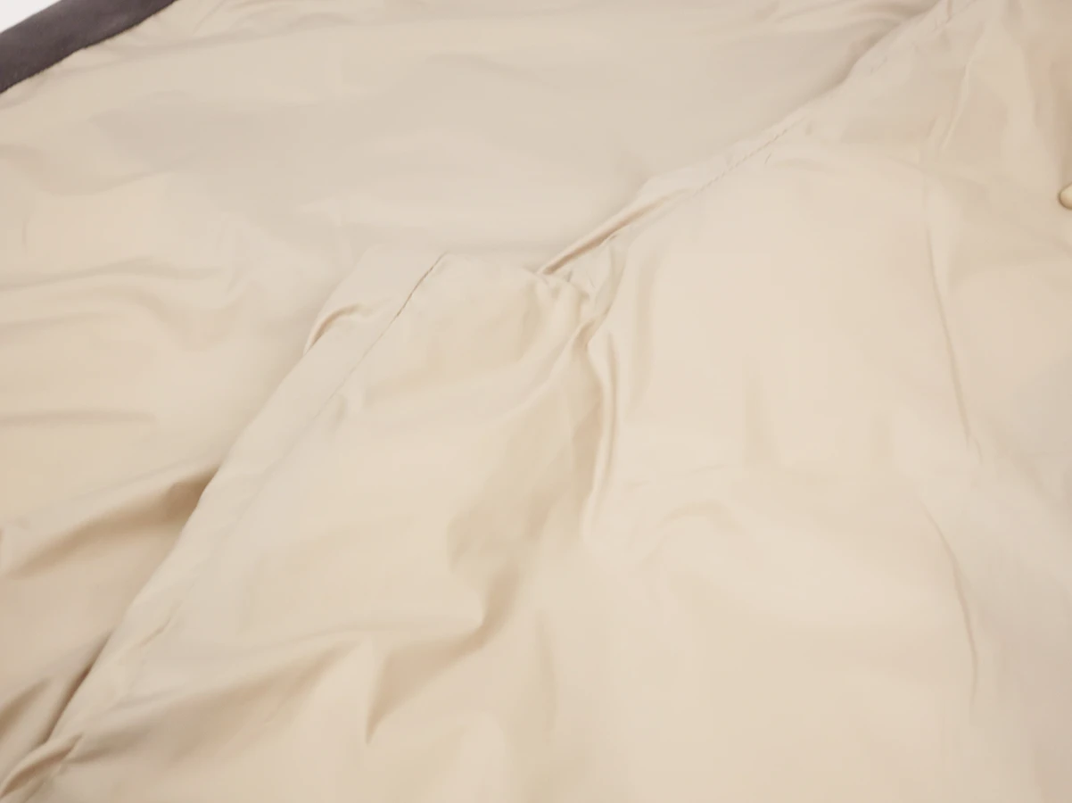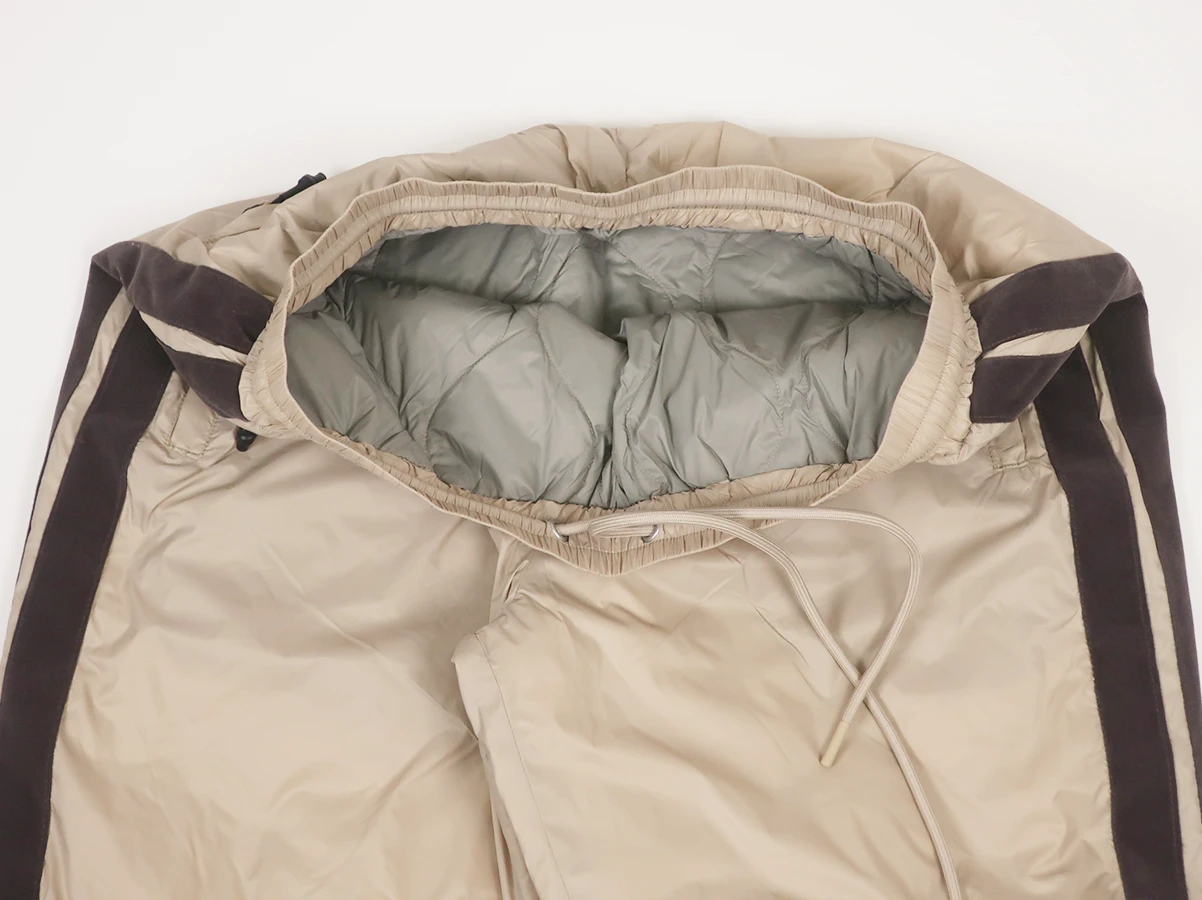 軽量で保温性に優れた800FPダウンを使用、表裏で印象の異なるデザインが楽しめ、セットアップ対応でスタイリングも自在です。表側サイドには渋い光沢感のあるベロア生地の配色ライン、裏側はヘチマキルトダウン、気分やコーデに合わせて楽しめるリバーシブル仕様に仕上げました。
