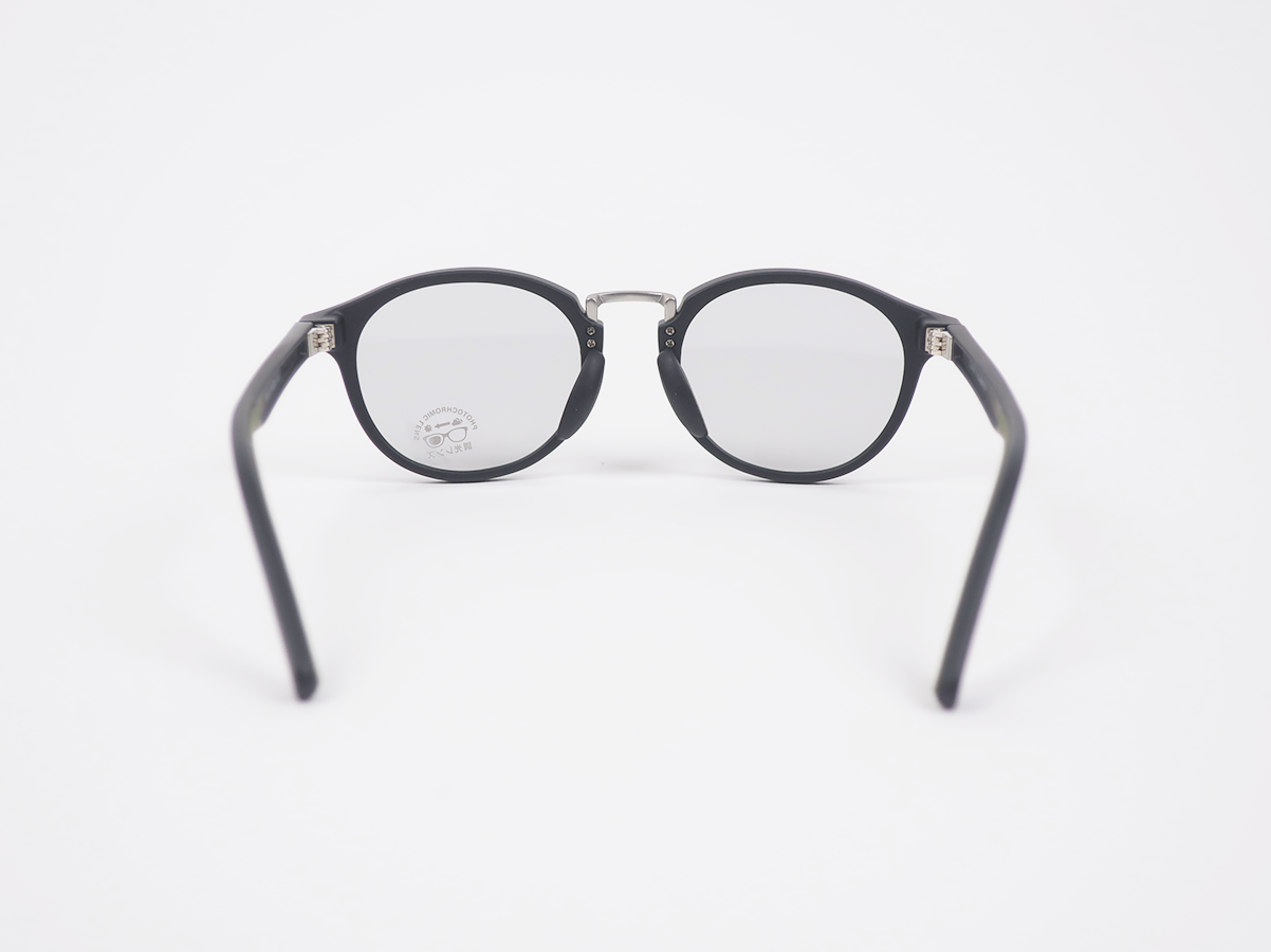 フレーム全体をスリムに仕上げる事で見た目、着用感共に軽快さを感じられるがメタルのカシメ(ドット)でクラシックさも演出されている。