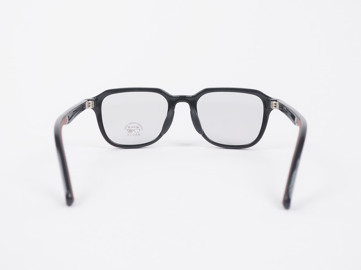 ビンテージをモチーフにしたスクエアフレームが個性を感じさせつつ、あくまでもさりげなく自然な顔馴染みになるようバランスを整えられている。