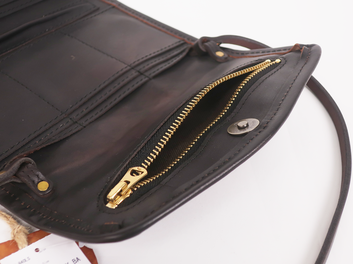 内装にはコインポケット×1、フリーポケット×2、カードポケット×9、外装にはバッグポケット×1、ペンポケット×1が付属します。荷物を詰め込んで放浪したくなるを意味するBaggage Load Wanderlustの頭文字をとったB.L.W.が刻印されます。
