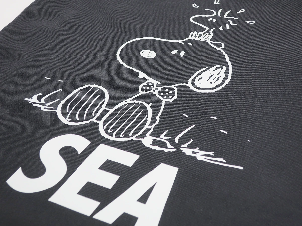 フロントにはスヌーピーのグラフィックを配置。裏面にはWIND AND SEAのロゴグラフィックをプリントし両面で異なる表情を楽しめるデザイン。