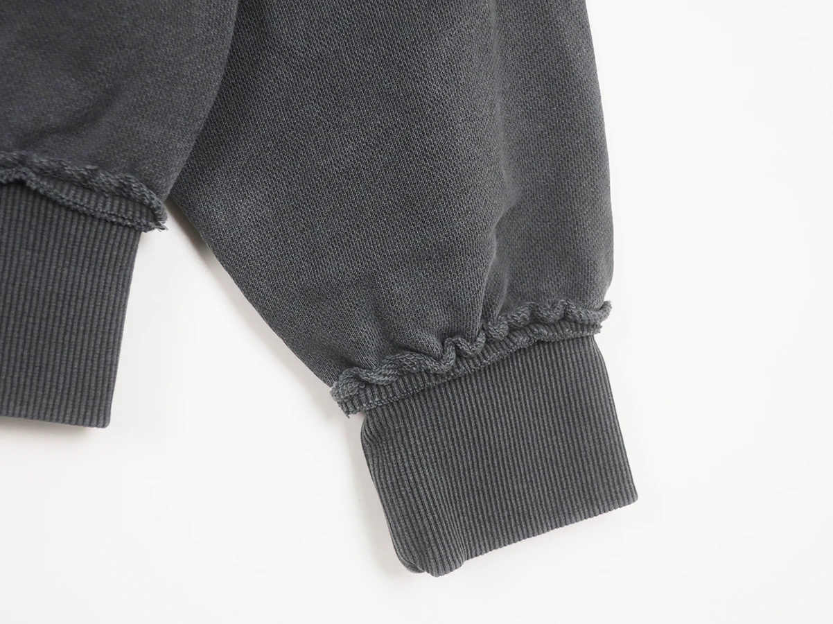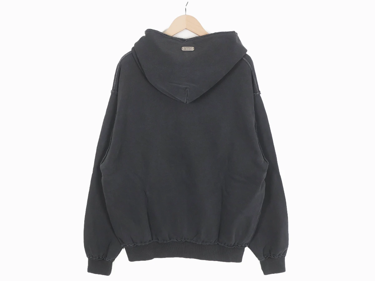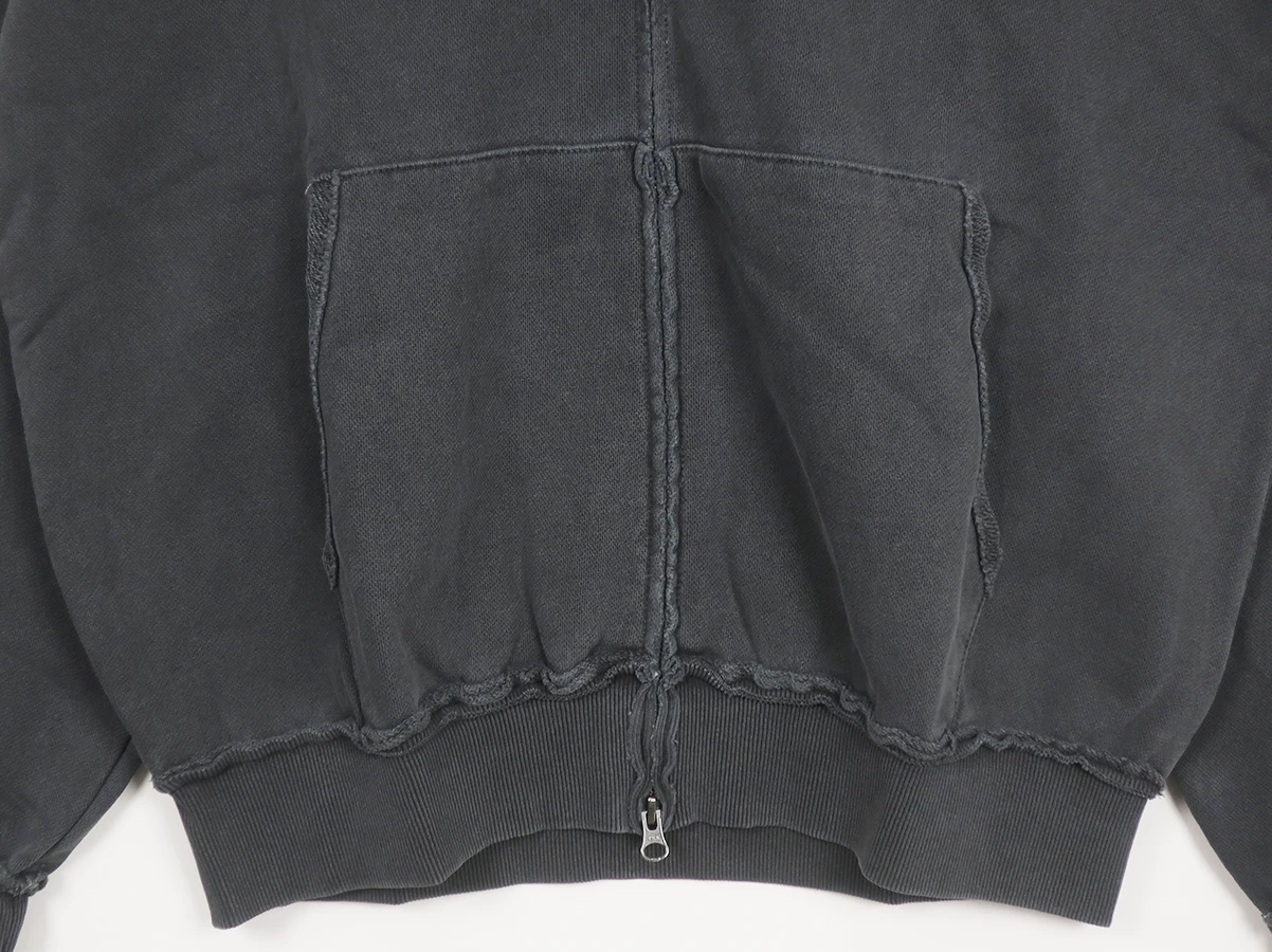 ピグメント加工による色褪せた風合いと随所に施されたダメージが特徴のジップアップスウェットシャツ。