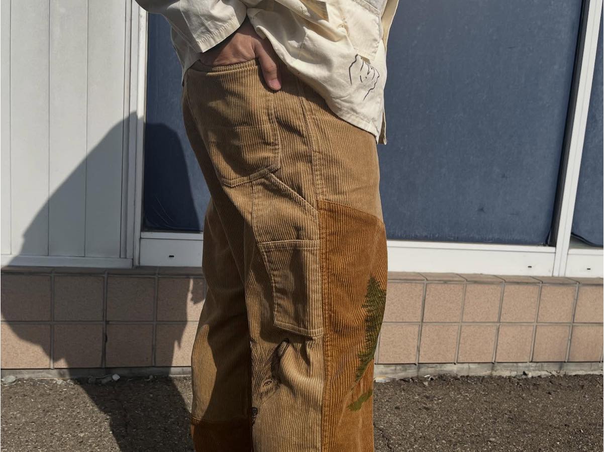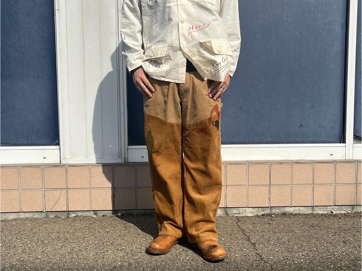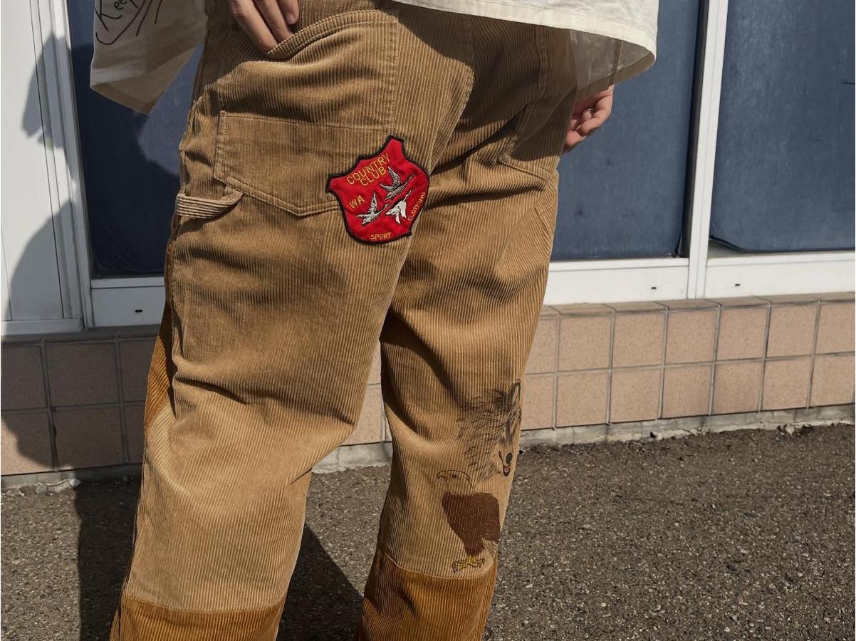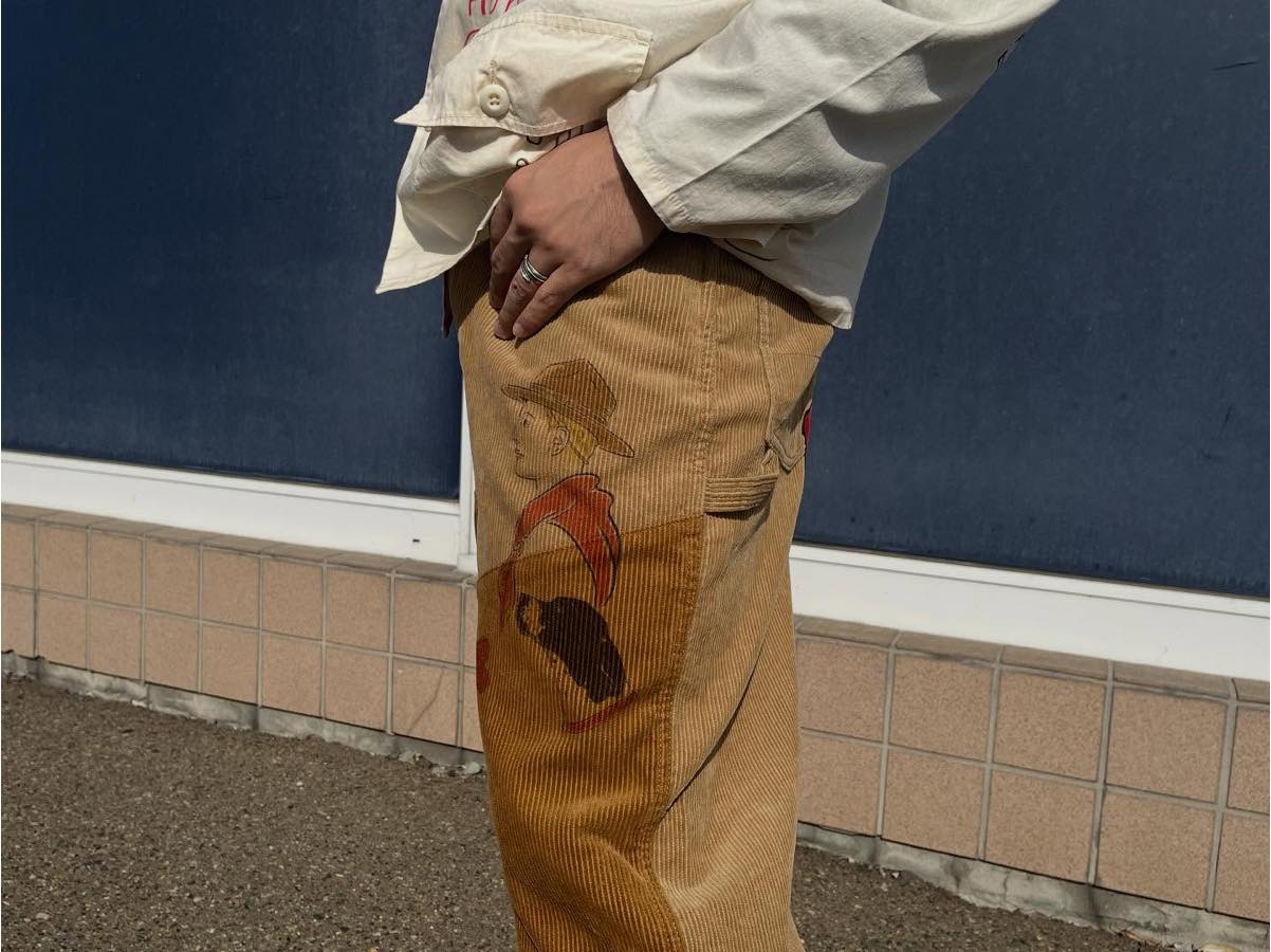 各所にプリントによるグラフィックととワッペンを配置したコーデュロイパンツです。